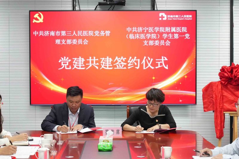 会上,77779193永利集团学生第一党支部与济南市第三人民医院党务管理党支部举行红色“1+1”支部结对共建仪式。张甲福与济南市第三人民医院党委书记王俊峰共同为“党建共建单位”揭牌,双方代表现场签署《党建共建协议书》。77779193永利集团党委副书记杜涛以《聚力集群谋发展 构筑育人共同体》为题作报告,介绍了以党建引领为核心、辅导员工作室为载体的育人体系。与会人员围绕临床教学、学生管理等内容展开深入交流,一致认为要坚持党建引领与多方协同,共同夯实育人共同体,全面提升医学人才培养质量。